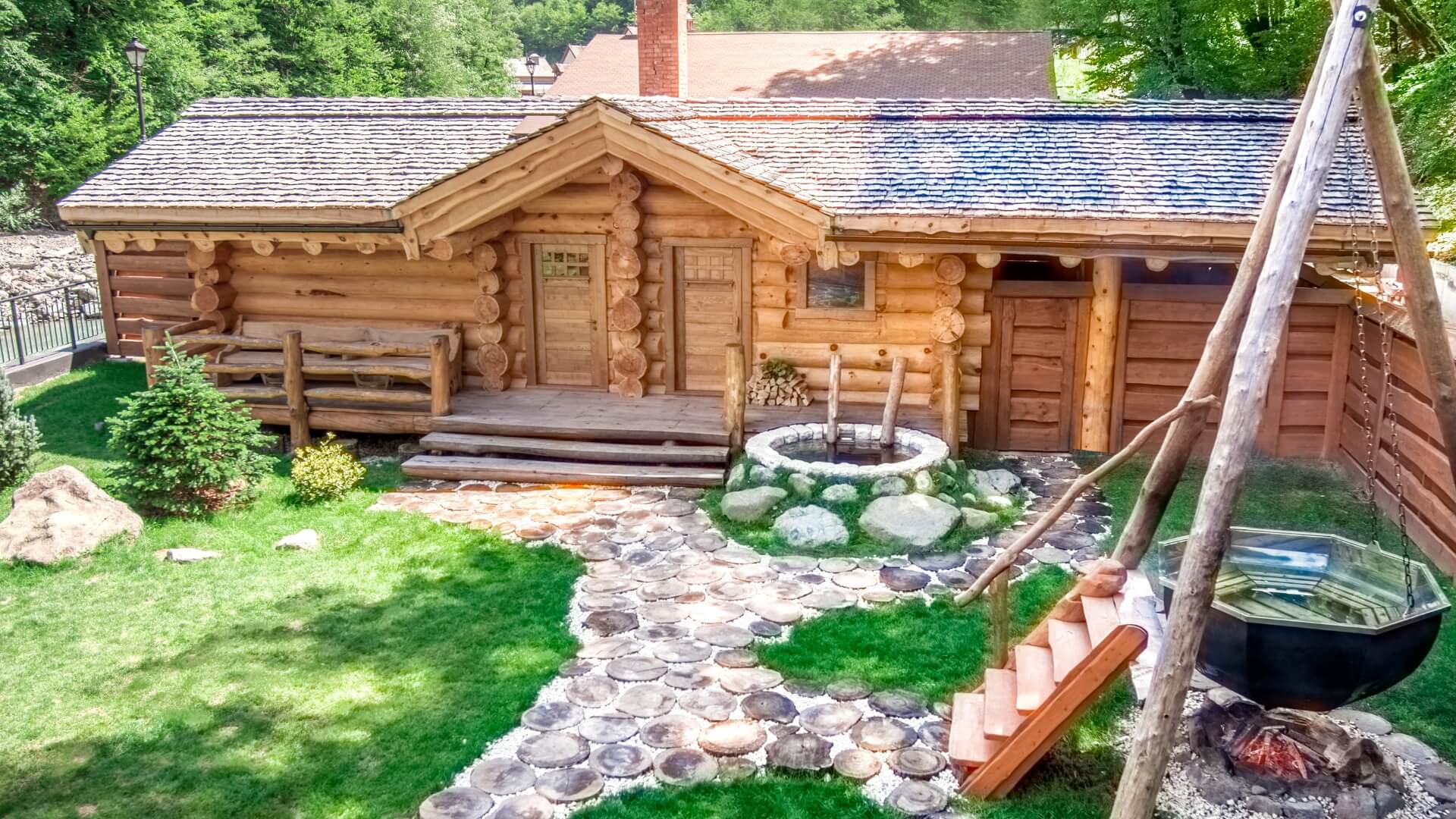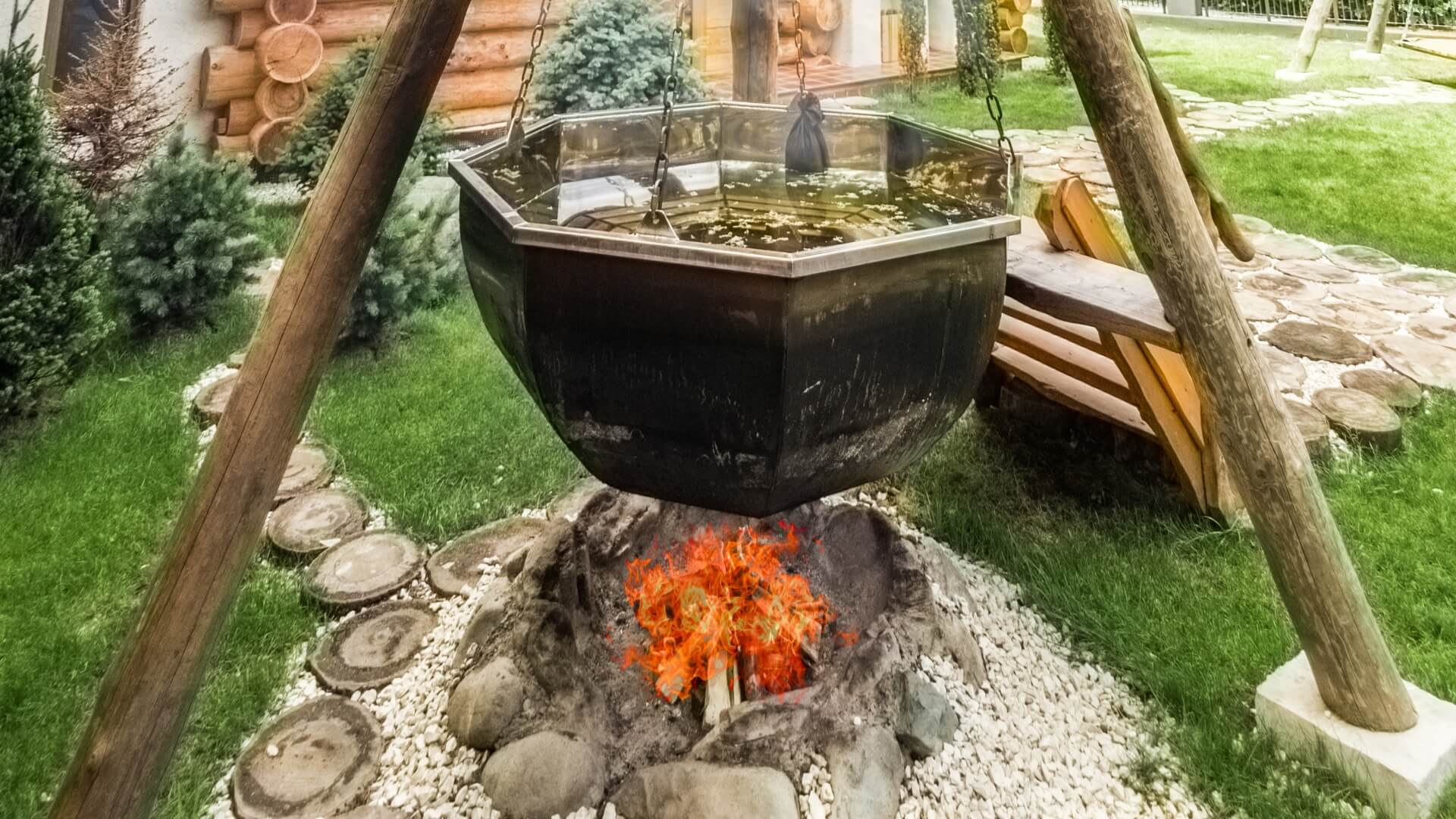 - Банный дворик с чаном на огне с эвкалиптовым отваром и банная качель