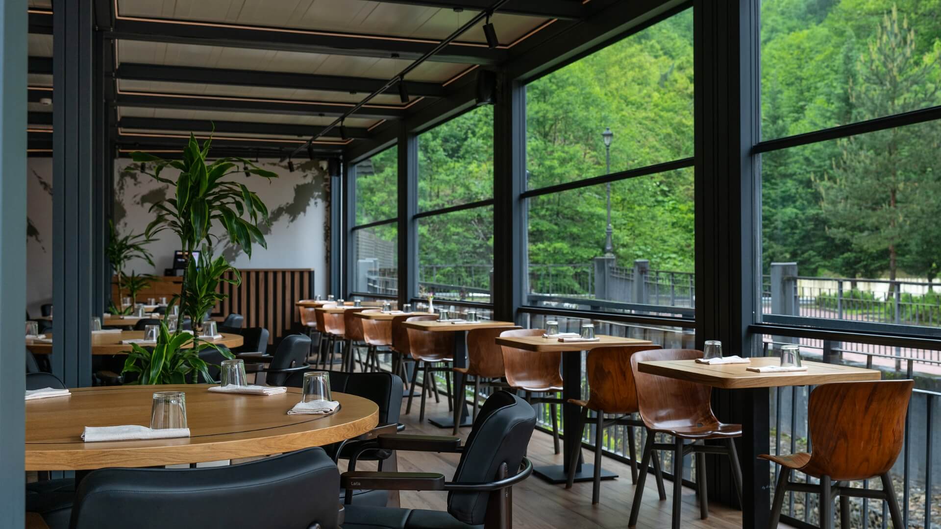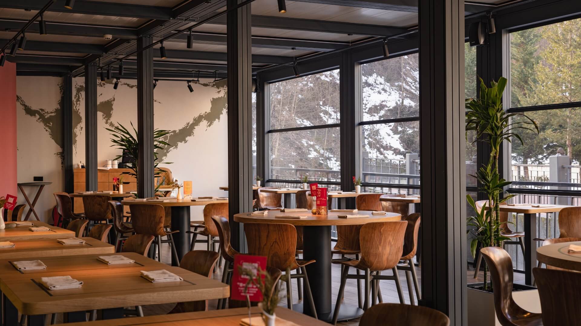 Стильный интерьер с видом на горы создает уютную атмосферу для любого времени дня. Место одинаково подходит для завтрака перед катанием, обеда с видом на склоны и ужина с коктейлями.