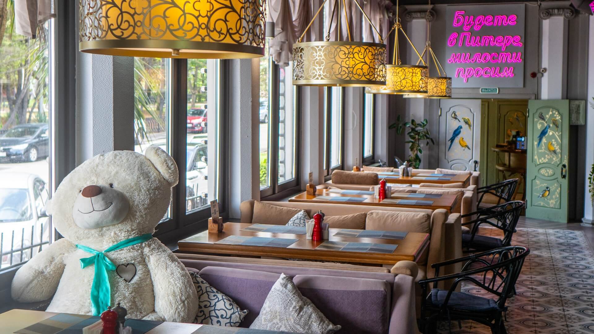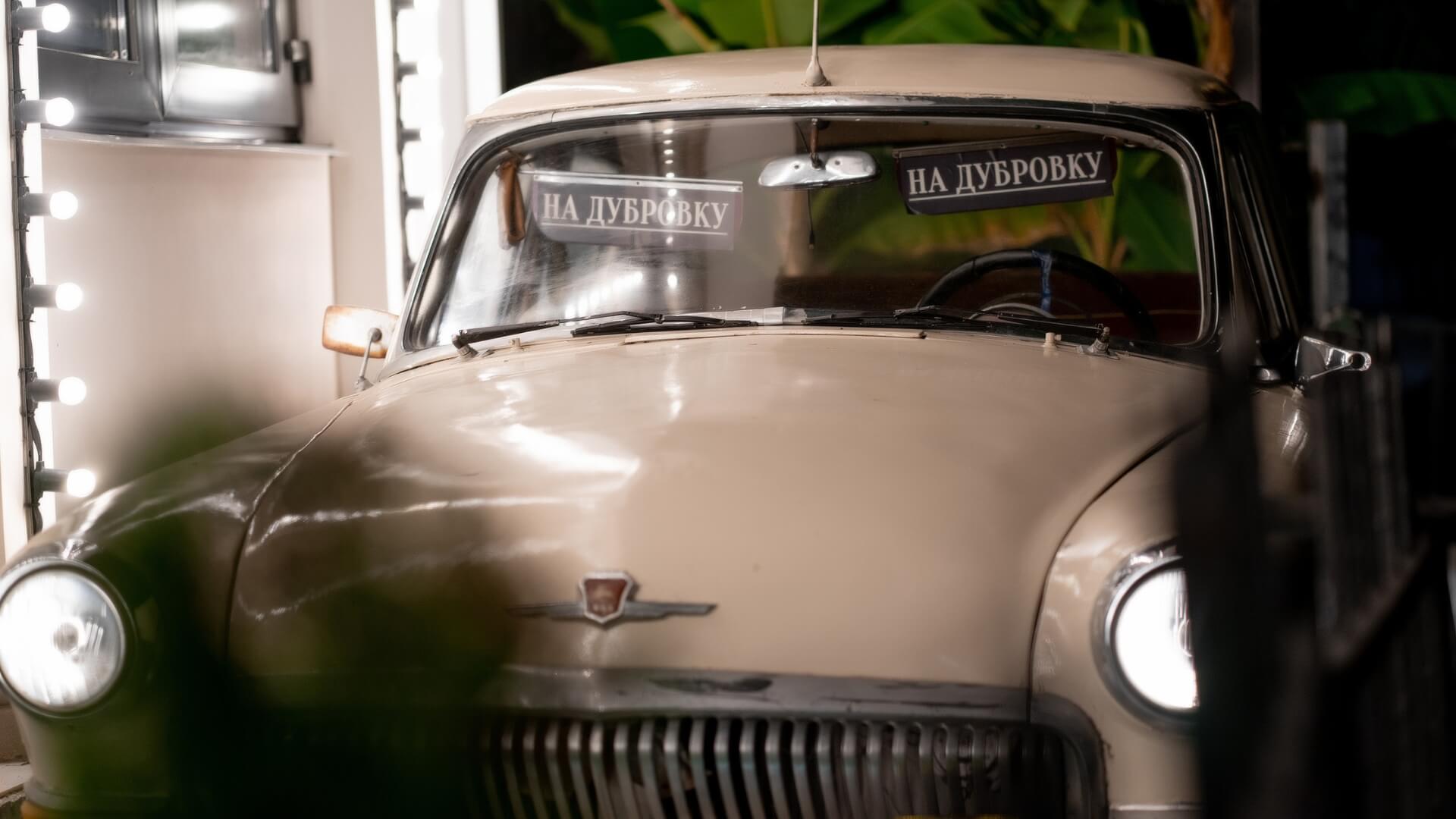 Интерьер стилизован под советскую эпоху: «Волга», радиоприёмники, винтажные детали. Но при этом всё современное и комфортное.