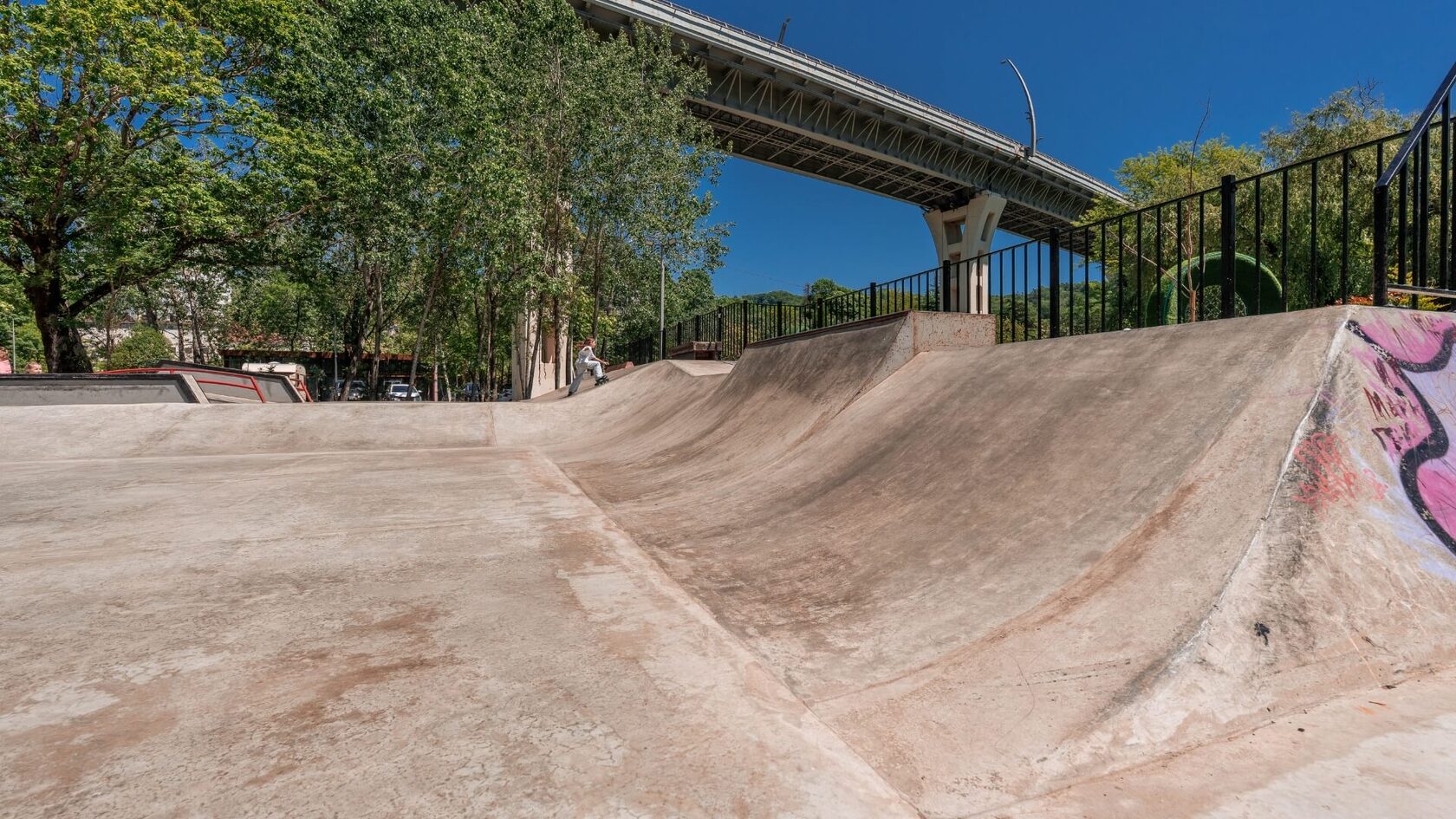 - Современный скейт-парк с рампами и препятствиями