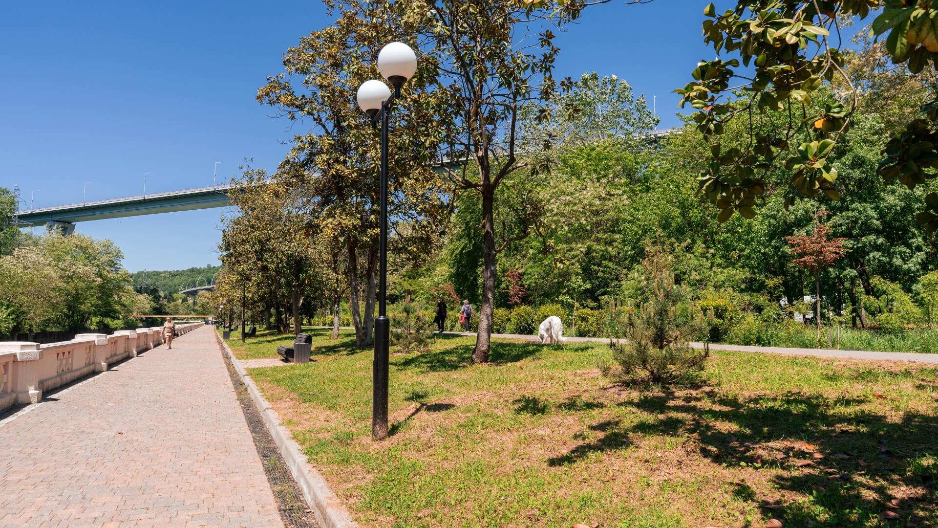 2,5-километровый прогулочный маршрут вдоль реки Мацеста, модернизированный по нацпроекту «Жильё и городская среда»: велодорожки и беговая полоса под тенью магнолий, скейт-парк, воркаут- и баскетбольная площадки, детский городок и деревянные пирсы-террасы с видом на сталинский виадук.