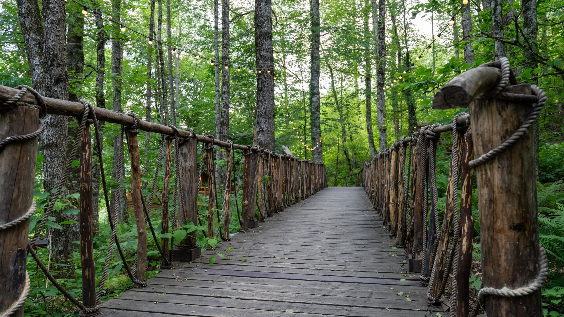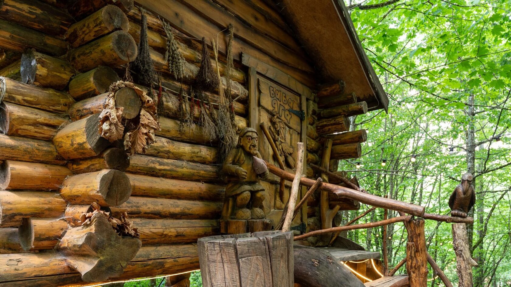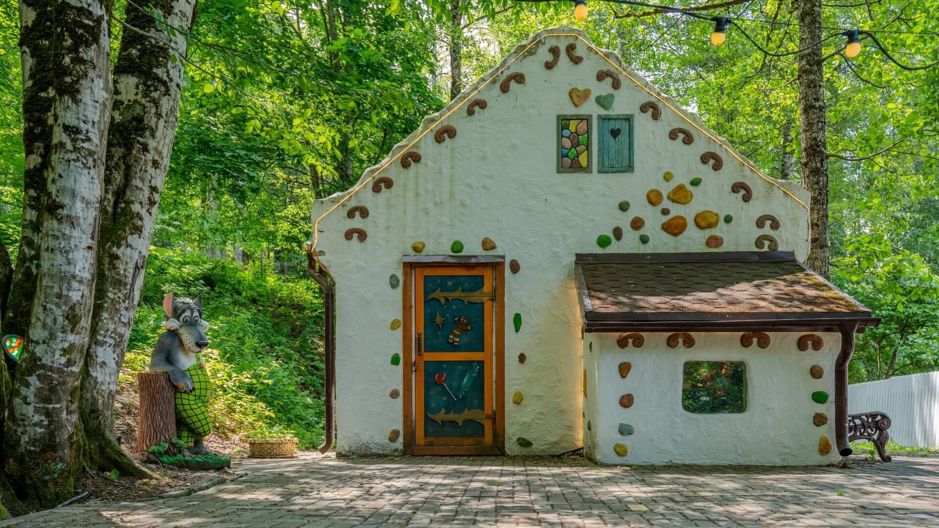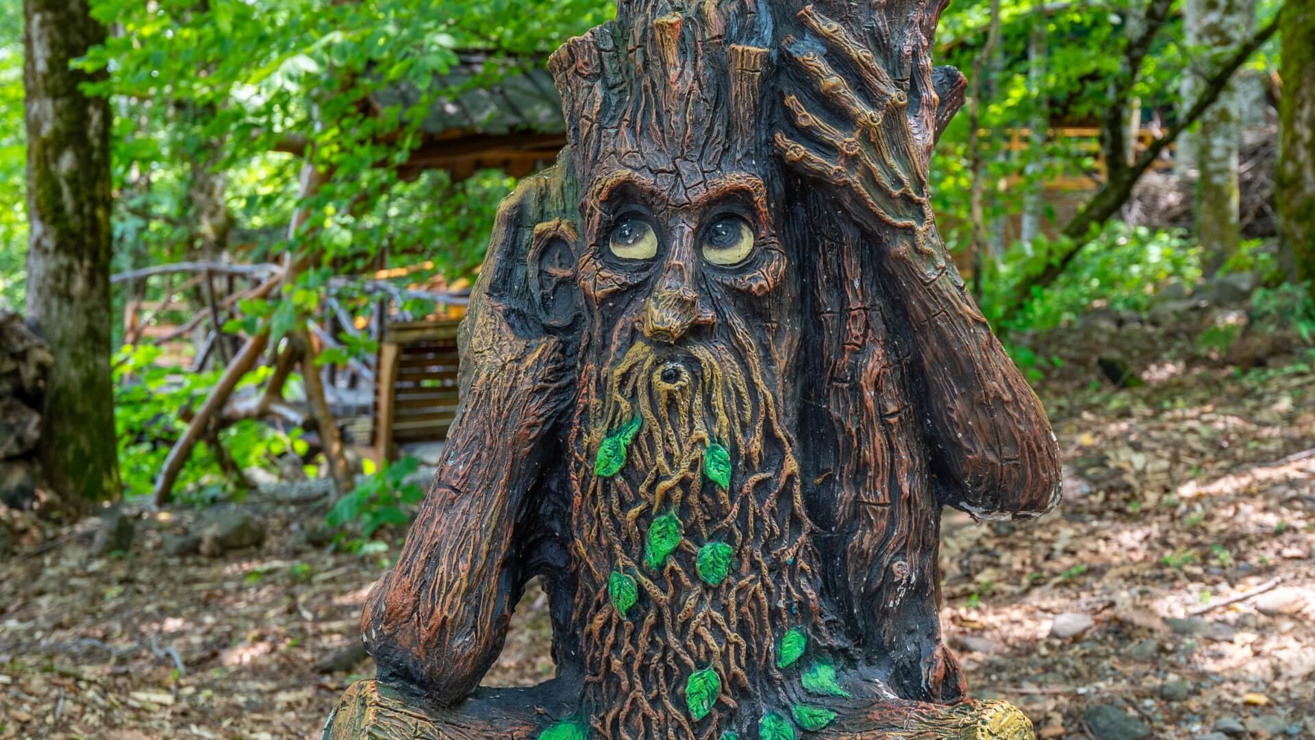 Среди живого горного леса вас встречают избушки, пряничный домик и небольшие замки, где обитают Баба Яга, рыцари и другие сказочные персонажи.