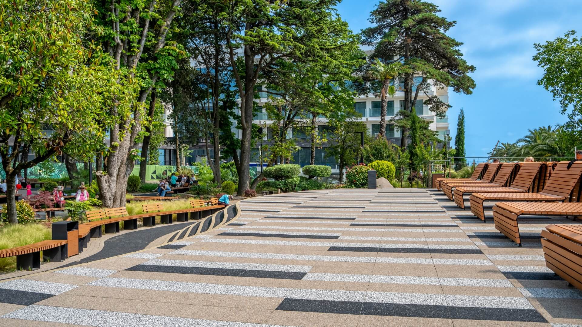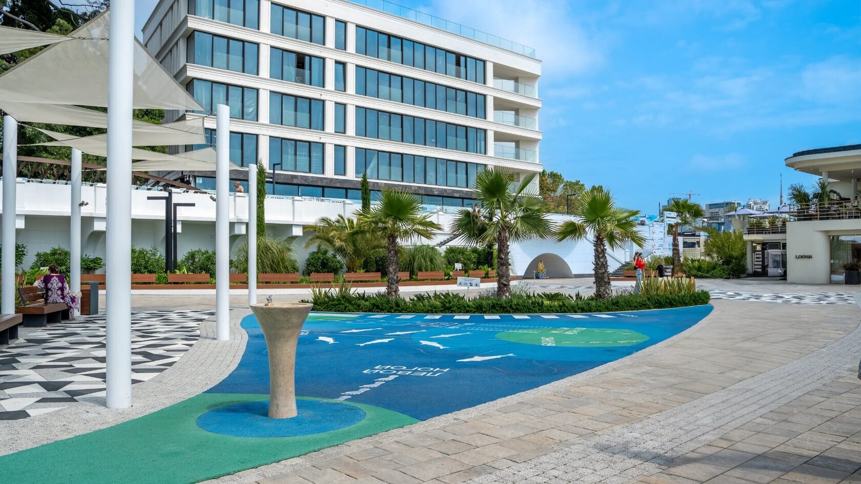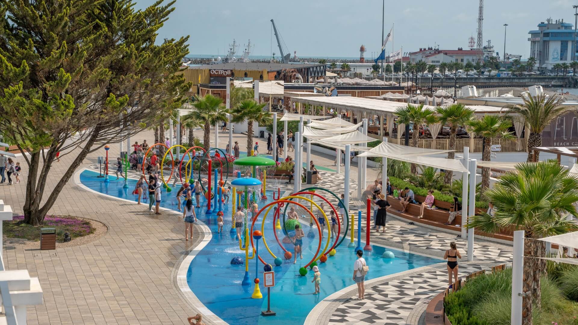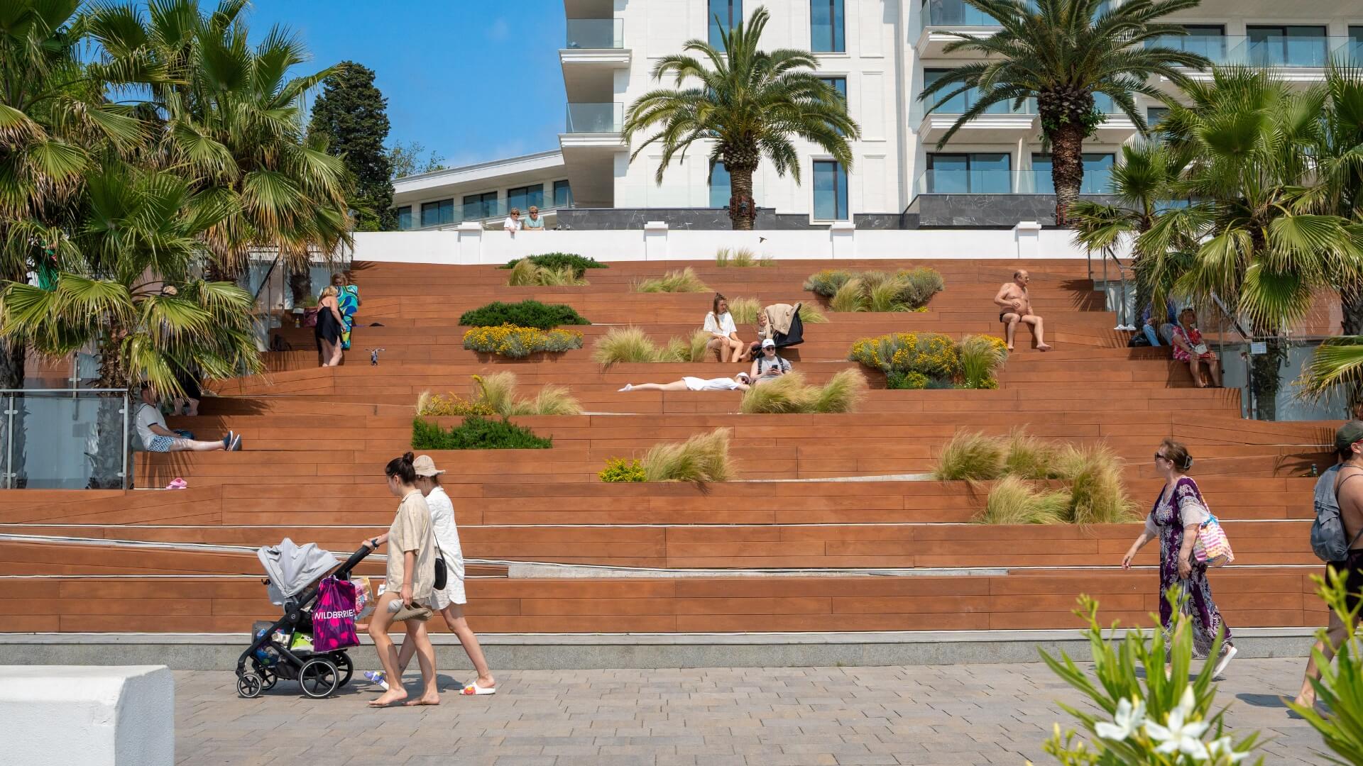 Обновлённая пешеходная линия протяжённостью около 2 км соединяет пляж и парк «Ривьера», образуя единый курортный променад с пальмовыми аллеями, амфитеатром для закатов, велопрокатом, уличными тренажёрами и кафе у самой кромки моря.